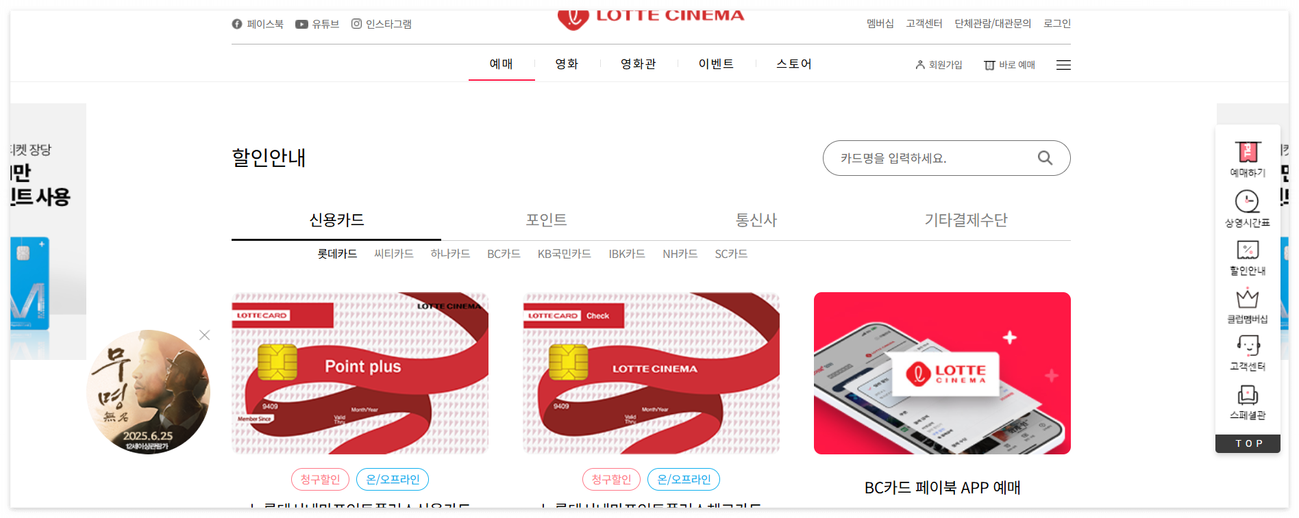 삼성, 신한, KB국민 등 주요 카드사와 제휴해 영화 티켓 할인, 팝콘 세트 할인 등을 받을 수 있습니다. - 특별 할인 데이